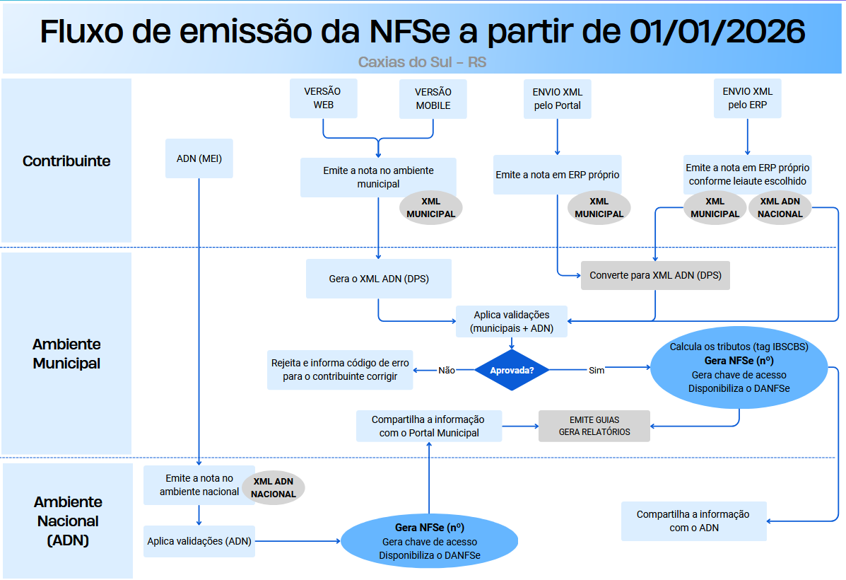 Nesse contexto, a partir de 01 de janeiro de 2026, a emissão da NFS-e será realizada com campos adicionais relacionados à tributação do IBS e da CBS e o município de Caxias do Sul compartilhará as informações ao Ambiente de Dados Nacional (ADN).